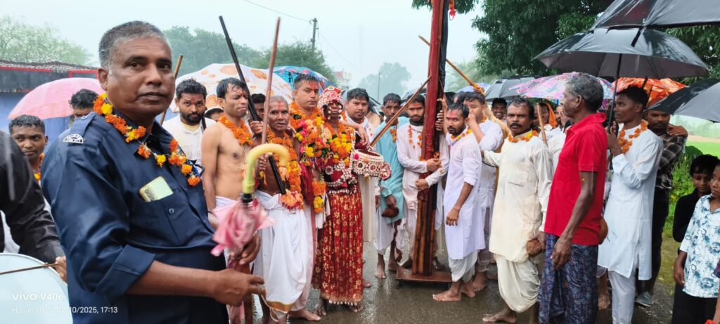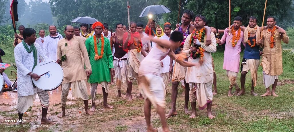 मुसलाधार बारिश के बीच देव दशहरा भाठीगढ़ में देवी देवताओं की शौर्य प्रदर्शन, राजा रजवाड़े जमाने की तलवार खड़ग जमकर भांजे गए