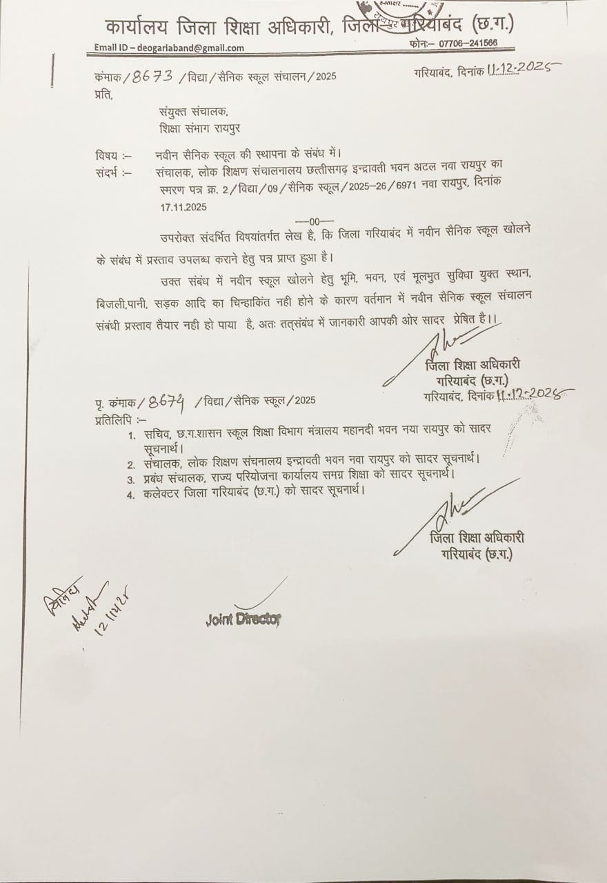 दरअसल स्वीकृत सैनिक स्कूल को जिला मुख्यालय अथवा रिक्त स्थल वाले किसी उपयुक्त स्थान की तलाश के लिए शिक्षा विभाग को जिले के पांचों एसडीएम को पत्र लिखा जाना था ।पर डीईओ ने ऐसा न कर कुछ प्रभाव शाली नेताओं के इशारे में केवल राजिम एसडीएम को पत्र लिख राजिम के इर्द गिर्द सैनिक स्कूल के लिए आवश्यक 70 एकड़ भूमि की मांग के लिए पत्र लिख दिया है।