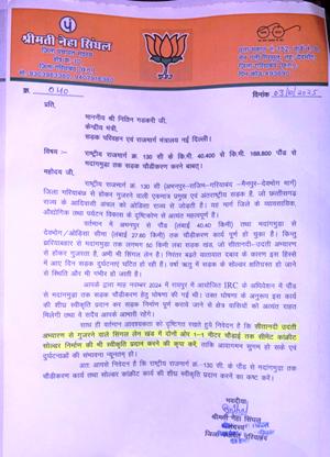 जिला पंचायत सदस्य श्रीमति नेहा सिंघल ने केन्द्रीय मंत्री गडकरी को मांगपत्र सौपकर बताया कि राष्ट्रीय राजमार्ग क्रमांक 130 सी अभनपुर राजिम गरियाबंद मैनपुर देवभोग से होकर ओड़िशा तक पहुंची है यह एक मात्र प्रमुख राष्ट्रीय सड़क है जो छत्तीसगढ़ राज्य के आदिवासी अंचल के लोगो को ओड़िशा राज्य से जोड़ती है। यह मार्ग जिले के व्यवसायिक औद्योगिक तथा पर्यटन विकास की दृष्टिकोण से अत्यंत महत्वपूर्ण है। वर्तमान में अभनपुर से पोड़ लंबाई 40.40 किमी तथा मदांगमुड़ा से देवभोग ओड़िशा सीमा तक 27.60 किमी तक सड़क चौडीकरण का कार्य पूर्व हो चुका है लेकिन मैनपुर के झरियाबाहरा से मदांगमुड़ा तक लगभग 50 किमी लंबा सड़क जो उदंती सीतानदी टाइगर रिजर्व से होकर गुजरता है। अभी भी सिंगल है सकरी सड़क खराब है। सड़क किनारे साइड सोल्डर की मिट्टी बह गये है जिससे बड़े -बड़े गड्ढे हो गये निरंतर बढ़ते यातायात के दबाव के कारण सड़क के इस हिस्से में आये दिनो दुर्घटनाएं घटित हो रही है।
