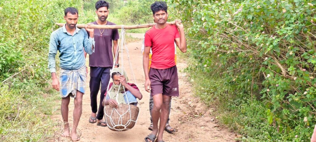विकास के दावे खोखले – ग्राम डूमरघाट सड़क नहीं, मरीजों को कांवर में लादकर मीलो पैदल चल अस्पताल तक लाना पड़ता है