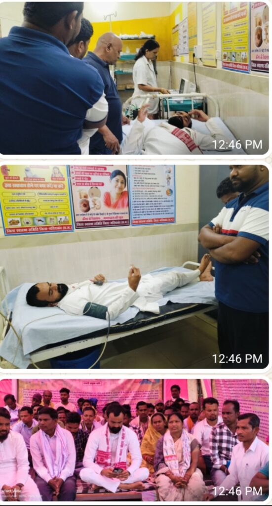 भीषण गर्मी में भुख हड़ताल कर रहे संजय नेताम की तबियत हड़ताल के दूसरे दिन गुरूवार रात 8ः30बजे के आस पास बिगड़ गई जिसे स्थानीय प्रशासन द्वारा स्थानीय सामुदायिक स्वास्थ्य केन्द्र ले जाया गया जहां डॉक्टरों ने स्वास्थ्य परीक्षण किया तो वहां कमजोरी महसूस करने के साथ ही बीपी शुगर कम हो गई है जिसके कारण संजय नेताम की तबियत बिगड़ गई है बावजूद इसके भुख हड़ताल के तीसरे दिन आज शुक्रवार को सुबह से धरना प्रदर्शन स्थल पर संजय नेताम और लोकेश्वरी नेताम अपना भुख हड़ताल जारी रखा है।