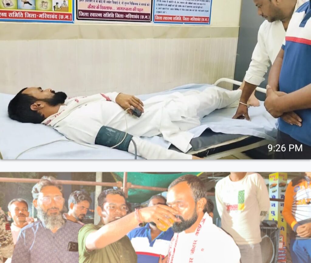 गरियाबंद। गरियाबंद जिले के मैनपुर एसडीएम कार्यालय के सामने नेशनल हाईवे 130 सी किनारे मैनपुर क्षेत्र के मूलभुत समस्याएं पेयजल, सड़क, बिजली, शिक्षा, अस्पतालत, सिंचाईं जैसे समस्याओं के समाधान को लेकर पिछले तीन दिनों से बगैर कुछ खाना पानी के भुख हड़ताल में बैठे जिला पंचायत सदस्य एवं कांग्रेस के वरिष्ठ नेता संजय नेताम की तबियत अचानक बिगड़ गई जिसे प्रशासन ने तत्काल अस्पताल पहुंचाया अस्पताल में डॉक्टर ने स्वास्थ्य परीक्षण किया और जांच करने पर संजय नेताम का बीपी शुगर बेहद कम हो गया है । साथ ही बेहद कमजोरी के कारण उन्हें डॉक्टरों ने आज सुबह ही भूख हड़ताल समाप्त करने की अपील किया था बावजूद इसके भीषण गर्मी में भुख हड़ताल कर रहे संजय नेताम। तीसरे दिन आज शुक्रवार को सुबह से धरना प्रदर्शन स्थल पर जिला पंचायत सदस्य लोकेश्वरी नेताम के साथ अपना भुख हड़ताल जारी रखा है ।