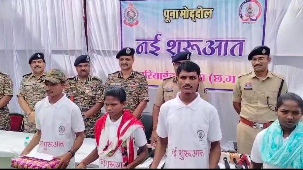 गरियाबंद। जिला गरियाबंद पुलिस लाइन में आज नक्सल ऑपरेशन आईजी अंकित गर्ग, रायपुर रेंज आईजी अमरेश मिश्रा एवं पुलिस मुख्यालय के वरिष्ठ अधिकारियों की मौजूदगी में नक्सल संगठन के बड़े कैडर का आत्मसमर्पण हुआ। पुलिस के बढ़ते दबाव और सरकार की पुनर्वास नीति से प्रभावित होकर दो महिला नक्सली अनीता व सुजाता तथा दो पुरुष नक्सली दीपक व कैलाश ने अपने हथियार डालकर समाज की मुख्यधारा में लौटने का निर्णय लिया।