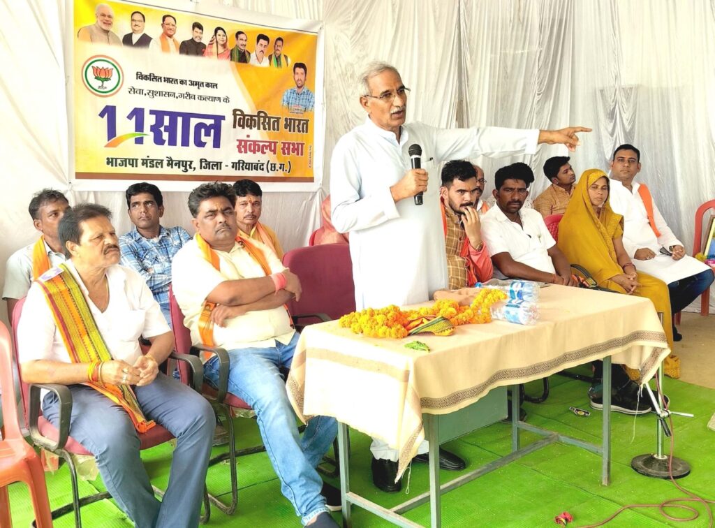 भाजपा जिला अध्यक्ष अनिल चन्द्राकर ने कहा प्रधानमंत्री नरेन्द्र मोदी के 11 साल सेवा सुशासन और गरीब कल्याण के लिए समर्पित रहा देश के इतिहास मे प्रधानमंत्री नरेन्द्र मोदी का यह कार्यकाल स्वर्णिम अक्षरो मे लिखा जायेगा। जिला पंचायत अध्यक्ष गौरीशंकर कश्यप ने कहा नरेन्द्र मोदी सरकार ने 11 वर्षो के भीतर देश के विकास के लिए जो कार्य किया है वह अपने आप मे एक मिशाल है आज हजारो लाखो लोगो को पक्का मकान का सपना पूरा हो रहा है प्रधानमंत्री आवास योजना के तहत मकान निर्माण कार्य किया जा रहा है। राष्ट्रीय सुरक्षा के क्षेत्र मे आत्मनिर्भर भारत की नीव मजबूत हुई है आवास योजना, आयुष्मान योजना, स्वच्छता अभियान, पीएमजनमन योजना, लखपति दीदी जैसे कार्यक्रमो से गरीबो को सीधा लाभ मिला है प्रधानमंत्री कौशल विकास योजना से रोजगार के अवसर बढे है किसानो को सम्मान निधि के रूप मे आर्थिक लाभ मिल रहा है। कार्यक्रम मे प्रमुख रूप से भाजपा मंडल अध्यक्ष संतोष यादव, पूर्व मंडल अध्यक्ष एवं कार्यक्रम के जिला सहसंयोजक दुलार सिन्हा, भाजपा मंडल महामंत्री महेश कश्यप, दिलीप साहू, रामदास वैष्णव, मनोज निर्मलकर, तिजू राम सिन्हा, किशोर यादव, गोविंद नायक, प्रमिला बाई सोनवानी, तुलसी राठौर, कृष्ण कुमार नेताम, हेमंत कुमार साहु, सुधीर राजपूत, चैनूराम नागेश, दिनेश सचदेव, लखन गिरी गोस्वामी, कोमल सोनवानी, मोहित द्विवेदी, नंदकिशोर चौबे, अजय बघेल, नरेश सोनवानी, जनक यादव, कुलेश्वर सिन्हा सहित वरिष्ठ जन भाजपा कार्यकर्ता उपस्थित रहे। कार्यक्रम का संचालन महामंत्री घनश्याम मरकाम ने किया एवं आभार प्रकट दुलार सिन्हा ने किया।